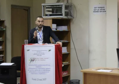 A l’occasion de la célébration du 66ème anniversaire de la journée nationale de l’étudiant, la bibliothèque universitaire a organisé, une journée d’information au profit des étudiants, ayant pour thème: «Orientation à l’exploitation optimale des services offerts par la bibliothèque universitaire et encouragement de l’innovation estudiantine», le 23/05/2022.