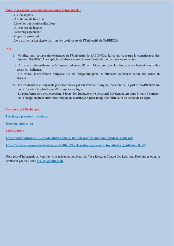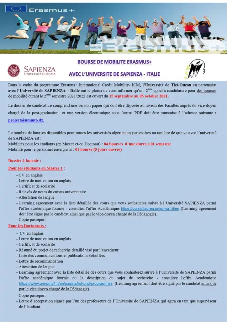 Bourse de mobilité ERASMUS+ avec l’université de SAPIENZA – Italie
