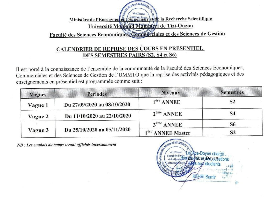 Calendrier de reprise des activités pédagogiques en présentiel FSECSG