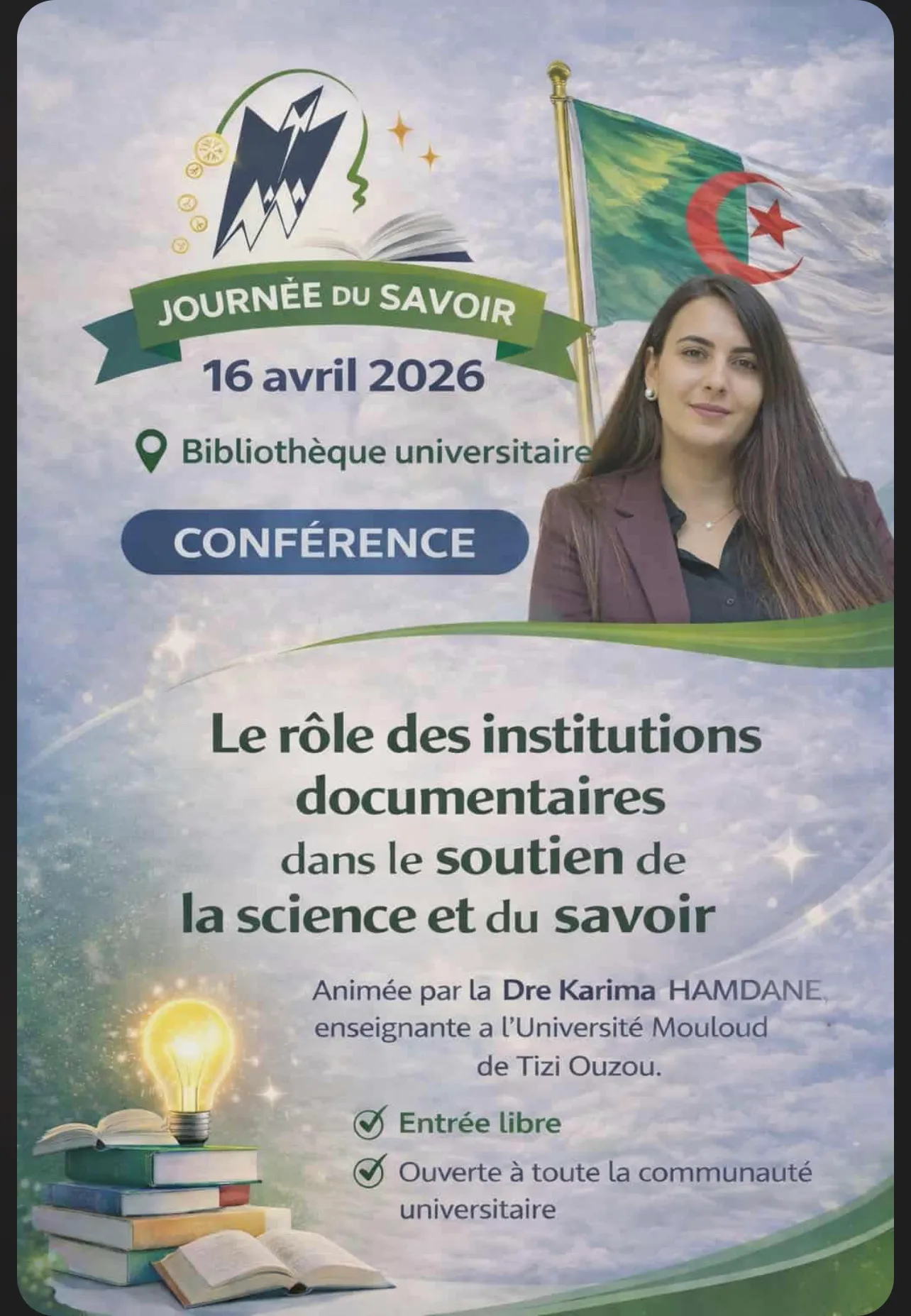 À l’occasion de la Journée du Savoir, la Bibliothèque universitaire a organisé une journée d’activités dédiée à la promotion du savoir et à la valorisation de ses ressources documentaires et numériques. Cette rencontre a proposé une exposition d’ouvrages consacrés à l’histoire de l’Algérie, des ateliers de présentation des ressources numériques de la bibliothèque, ainsi qu’une communication scientifique animée par Mme Karima HAMDANE (FSHS), portant sur le rôle des institutions documentaires dans la diffusion du savoir.