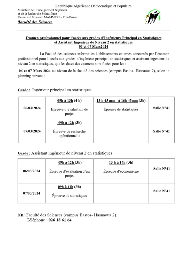 Centre d’examen : la Faculté  des sciences organise des examens professionnels