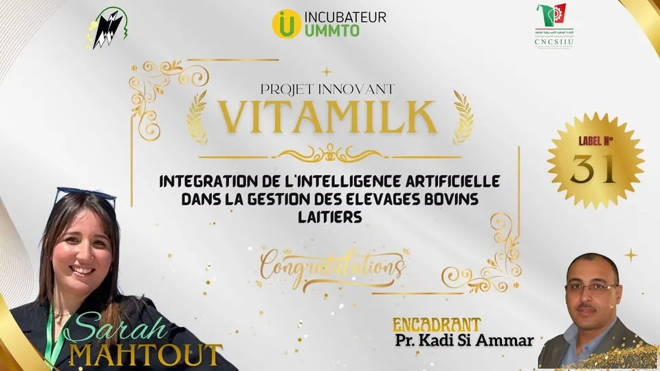 Félicitations à Melle MAHTOUT Sarah de la faculté des Sciences Biologiques et Agronomiques pour l’obtention du Label n°31, pour son projet VITAMILK, qui correspond à un projet d’intégration de l’intelligence artificielle dans la gestion des élevages bovins laitiers![]()