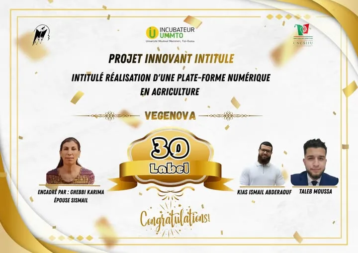 Félicitations à Mr AHERIKANCHIKH Said et Mr AZOUAOU Jugurtha de la faculté du Génie Électrique et Informatique pour l'obtention du Label n°29, pour leur projet LS Trad :...