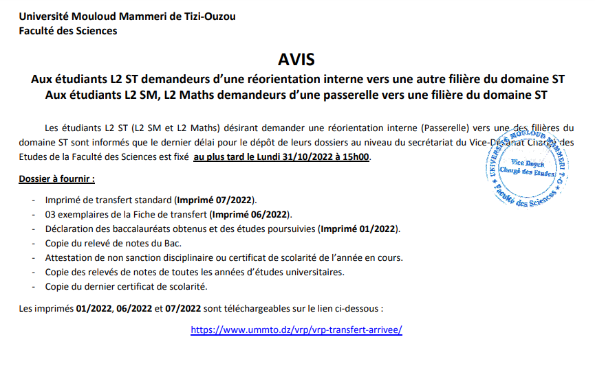 Avis aux étudiants ayant effectué un transfert, une réorientation, une reprise d’études, un master dans le cadre des 20 %, DEUA vers Licence et Ingénieur vers Master