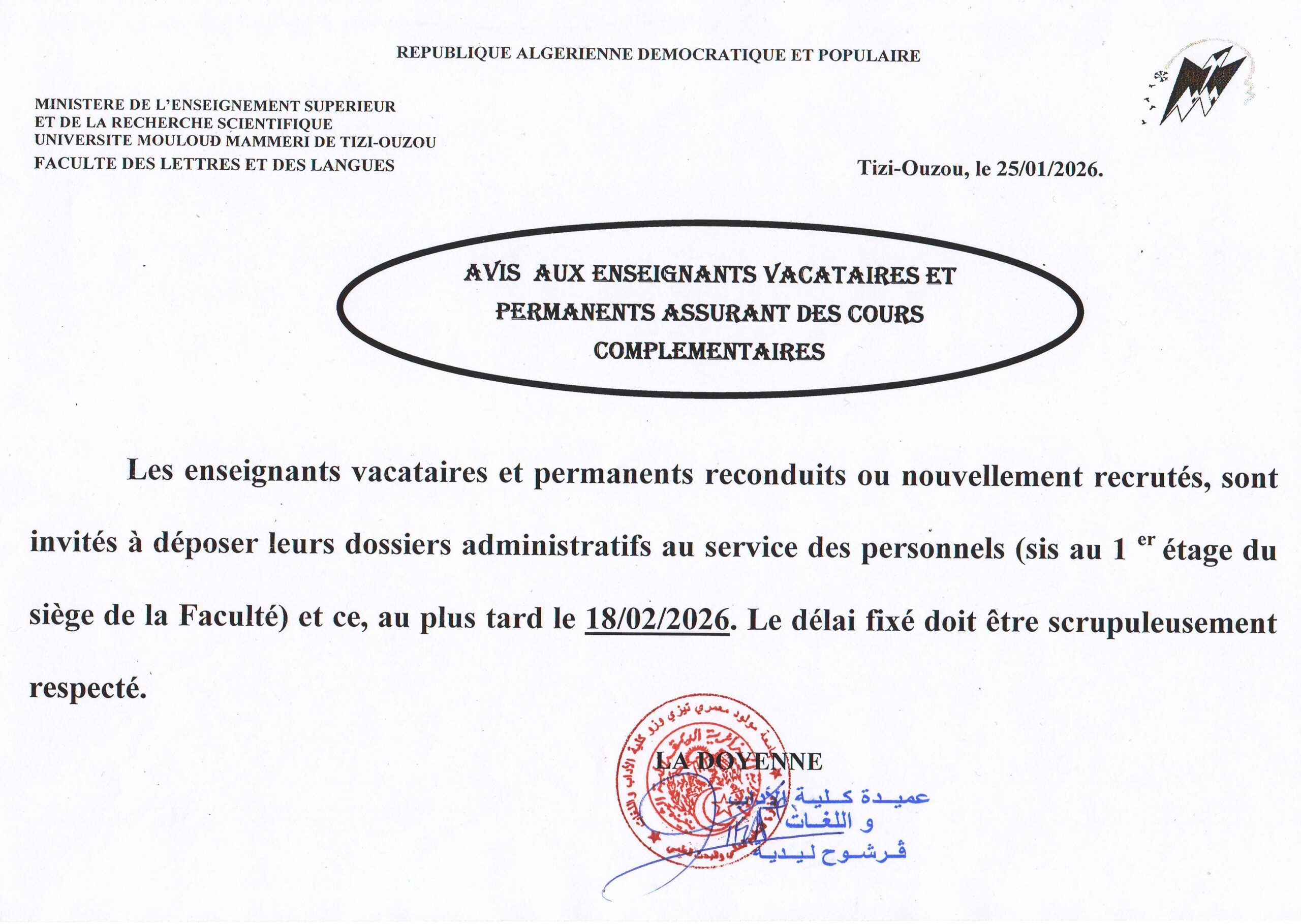 Avis aux enseignants vacataires et permanents assurant des cours complémentaires