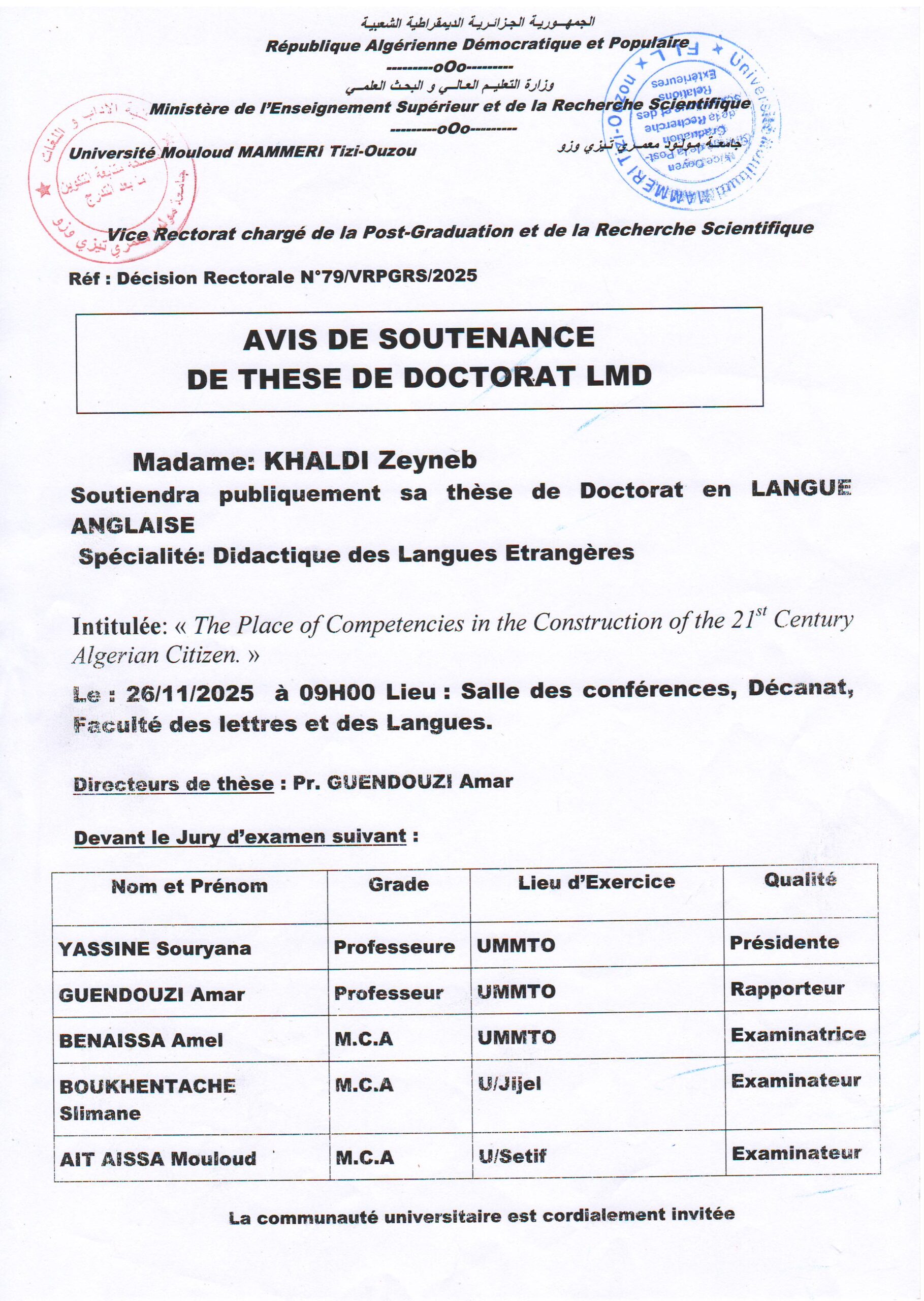 - مناقشة أطروحة دكتوراه ل م د في اللغة و الأدب العربي للسيد مراد عميروش