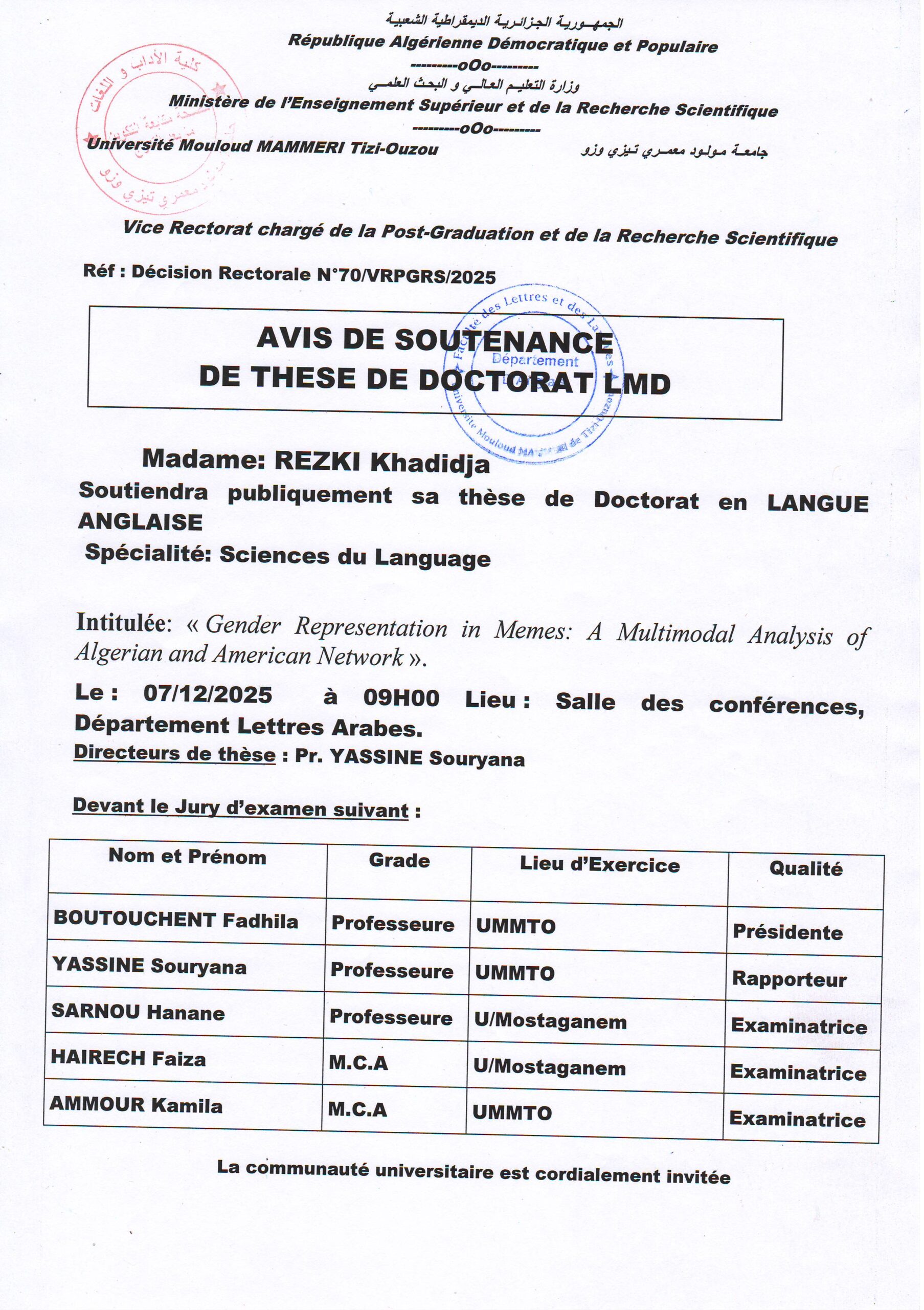 - Avis de soutenance de thèse de doctorat LMD de Madame REZKI Khadidja