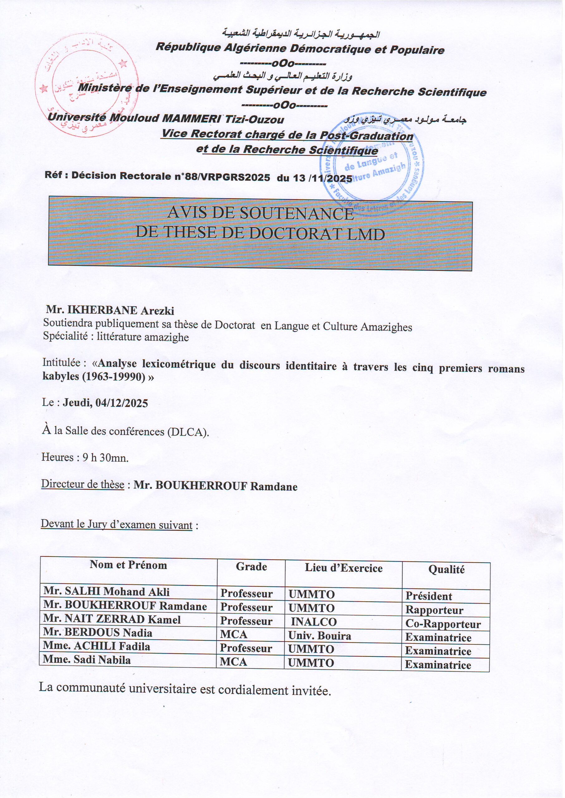 Avis de soutenance de thèse de doctorat LMD de Monsieur IKHERBANE Arezki