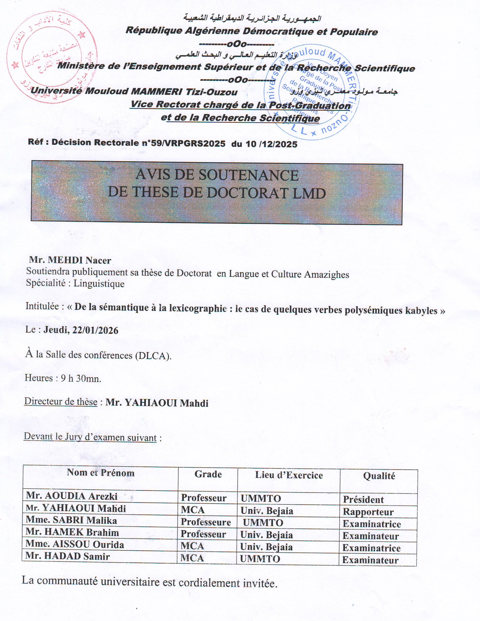 Avis de soutenance de thèse de doctorat LMD de M. MEHDI Nacer