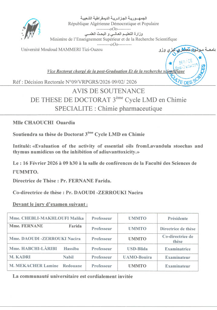 Avis de soutenance de thèse de doctorat 3ème cycle LMD en chimie spécialité : chimie pharmaceutique MLLE CHAOUCHI Ouardia