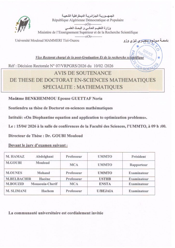 Avis de soutenance de Mme BENKHEMMOU Noria ep GUETTAF
