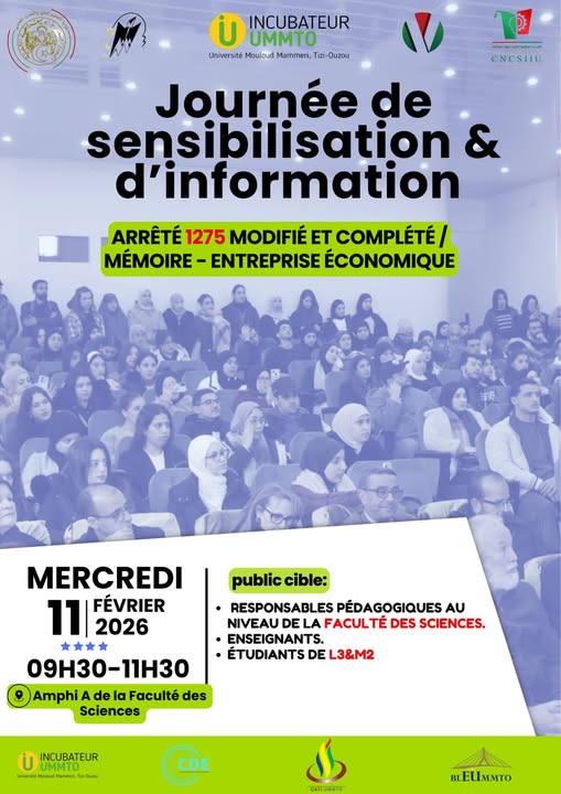 L’incubateur de l’UMMTO organise, ce mercredi 11/02/2025 à 9h30 à la faculté sciences, une journée de sensibilisation et d’information sur l’arrêté 1275 modifié et complété par l’arrêté N°008 du 23 février 2025. (l’Affiche) Cet événement cible les responsables pédagogiques, les enseignants et les étudiants en L3 et M2.