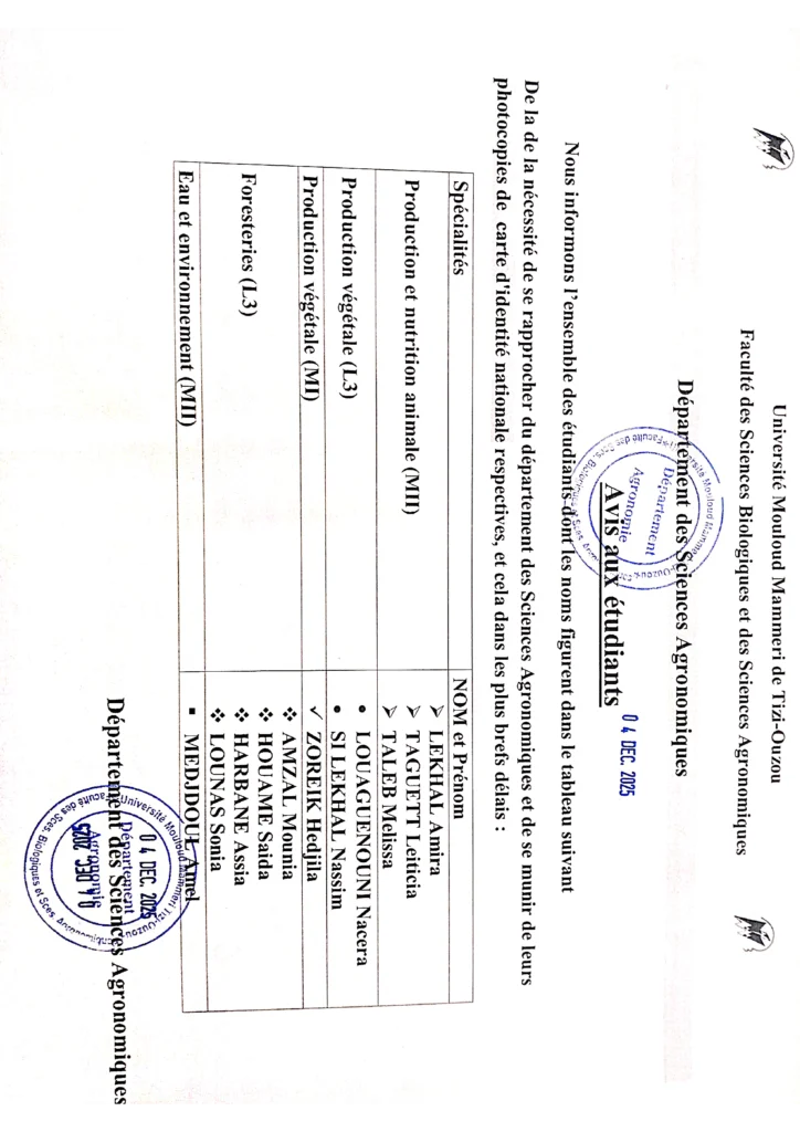 - Avis aux étudiants de la faculté des sciences biologiques et des sciences agronomiques