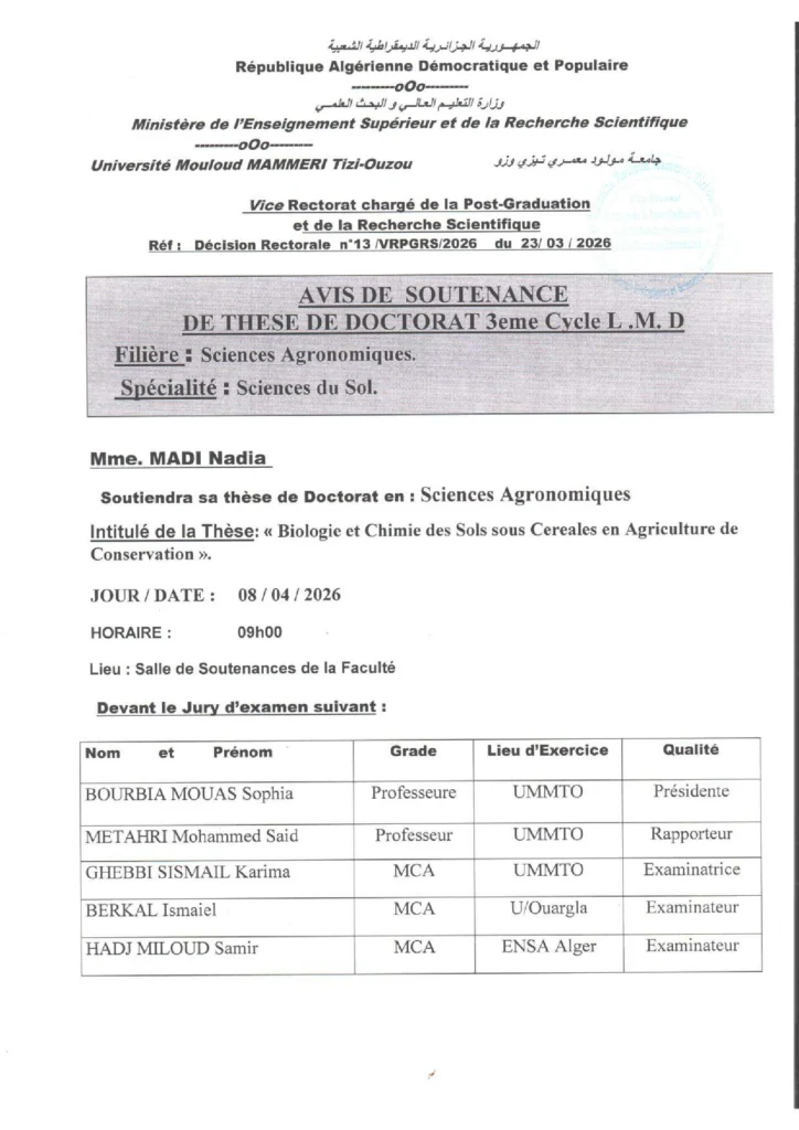 Avis de soutenance Doctorat 3eme cycle Madi nadia