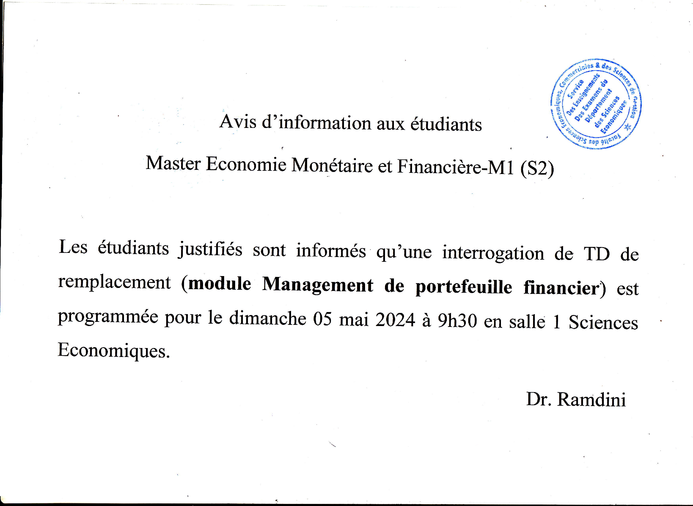Avis aux étudiants de M1 Economie Monétaire et financière.
