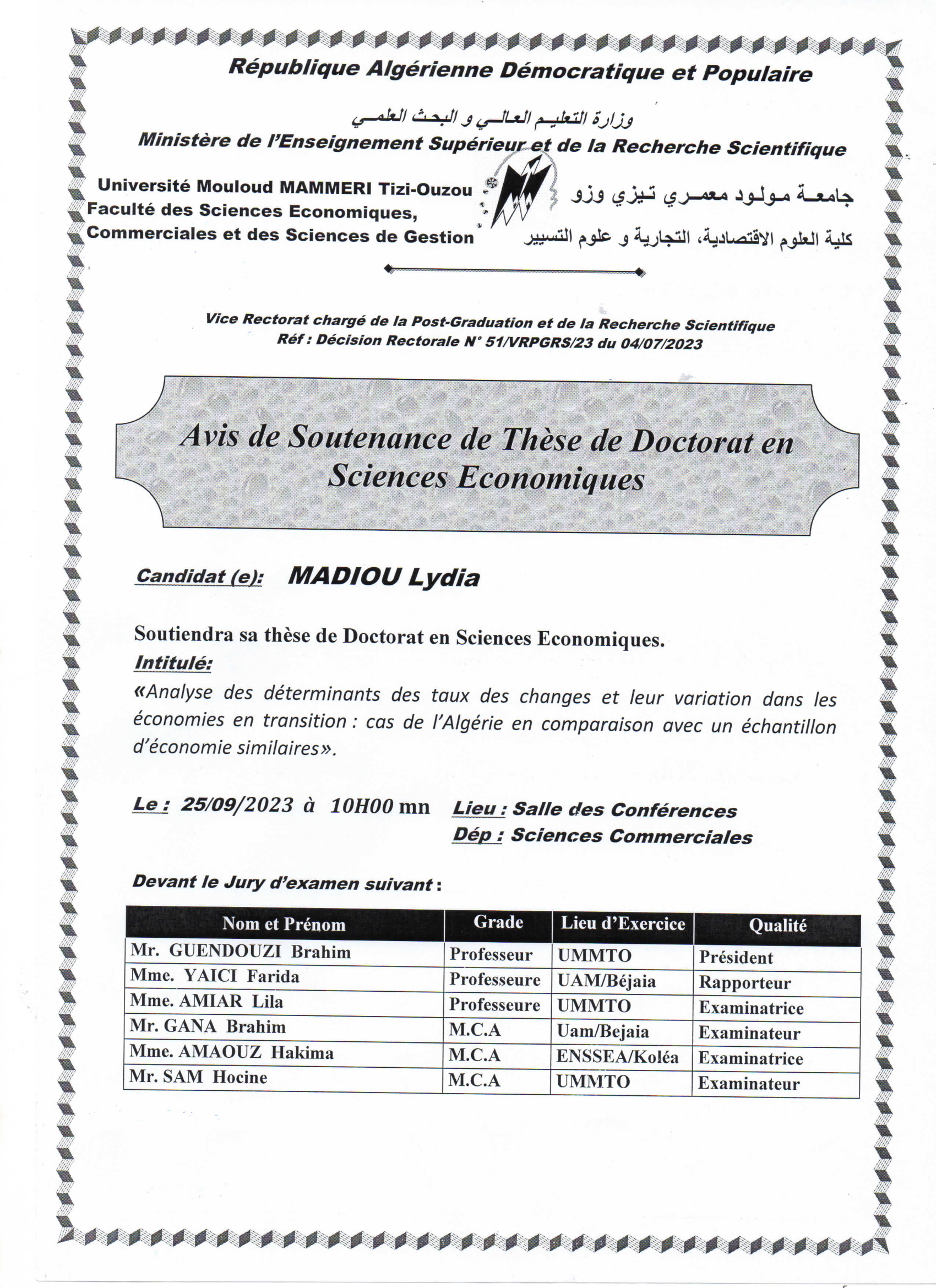 Avis de Soutenance de la thèse de Doctorat en Sciences Économiques de Mme MADIOU Lydia .