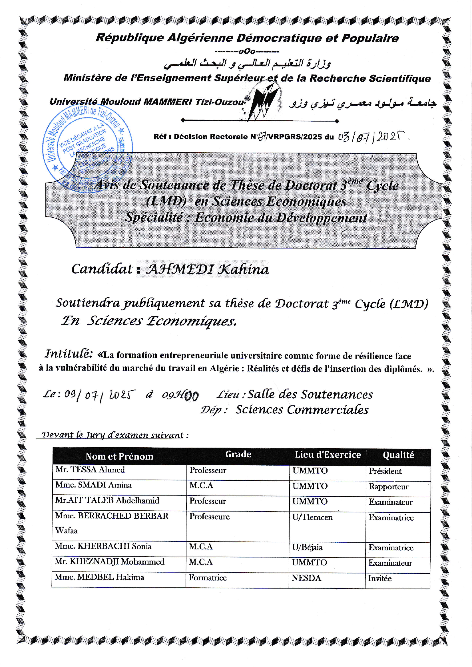 Avis de Soutenance de Thèse de Doctorat en 3éme cycle LMD en Sciences Economiques de Mme AHMEDI Kahina.