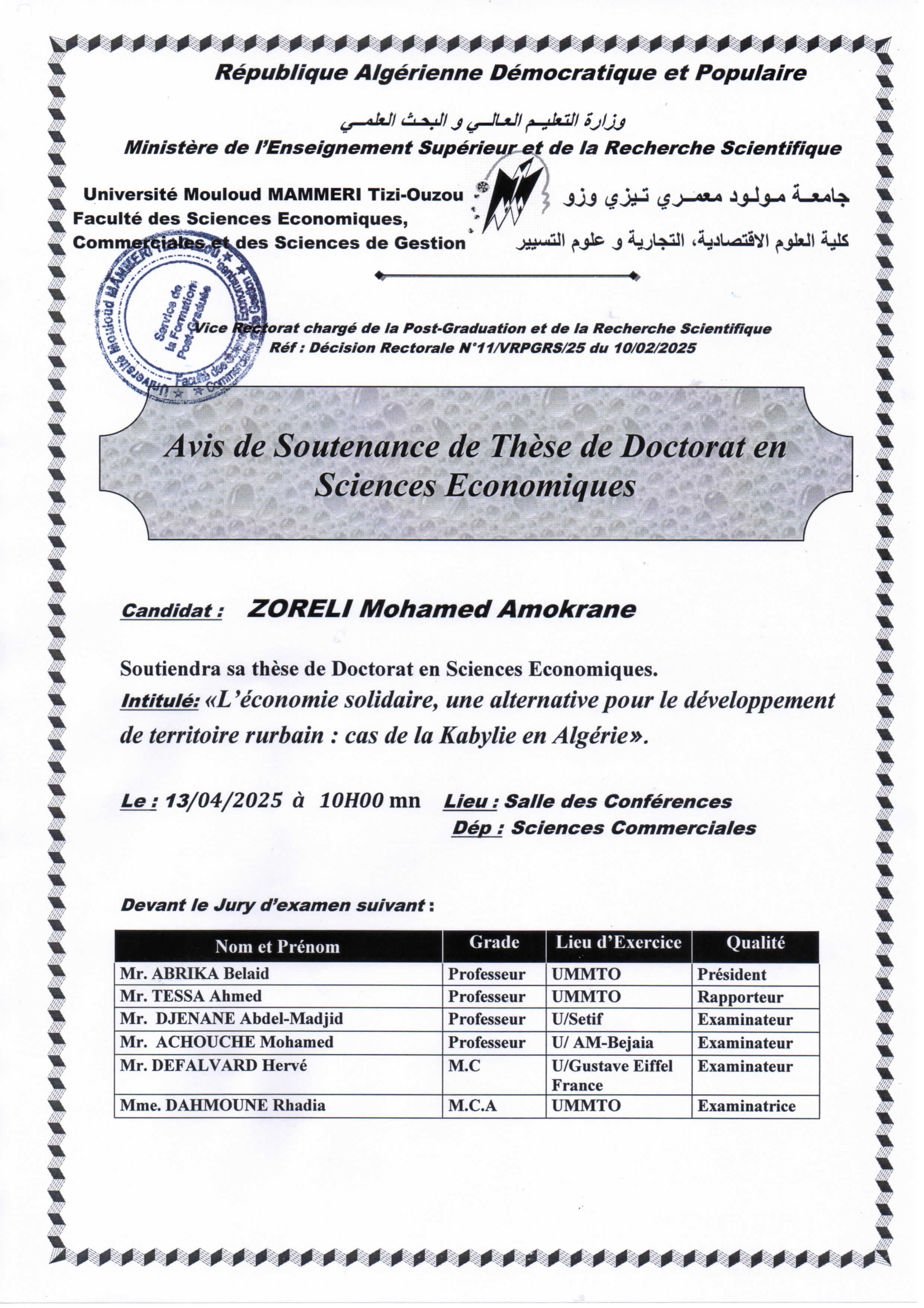 Avis de Soutenance de Thèse de Doctorat en Sciences économiques de Mr ZORELI Mohamed Amokrane.