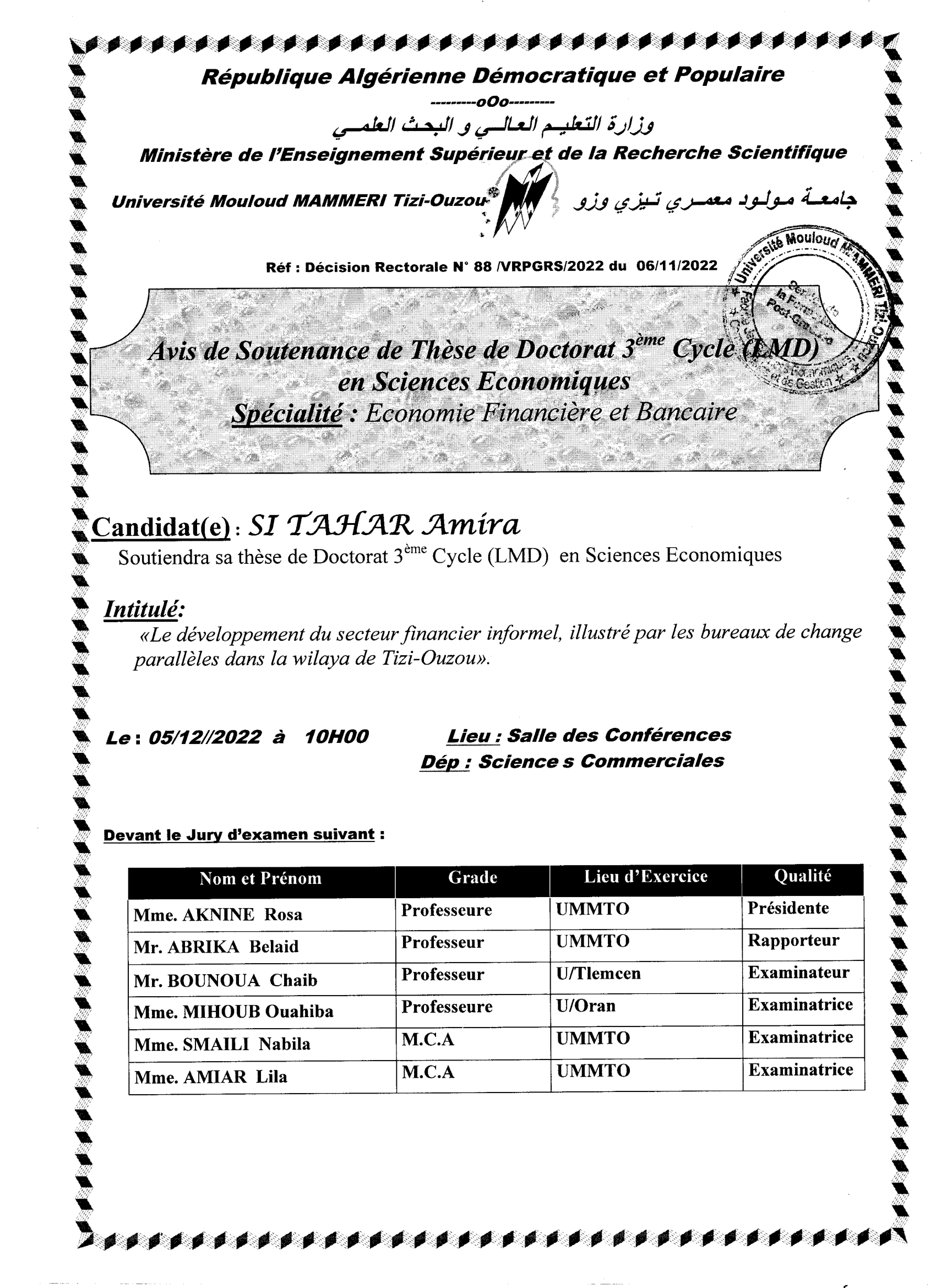 Avis de Soutenance de thèse de doctorat en Sciences économiques de Mme SI TAHAR Amira.