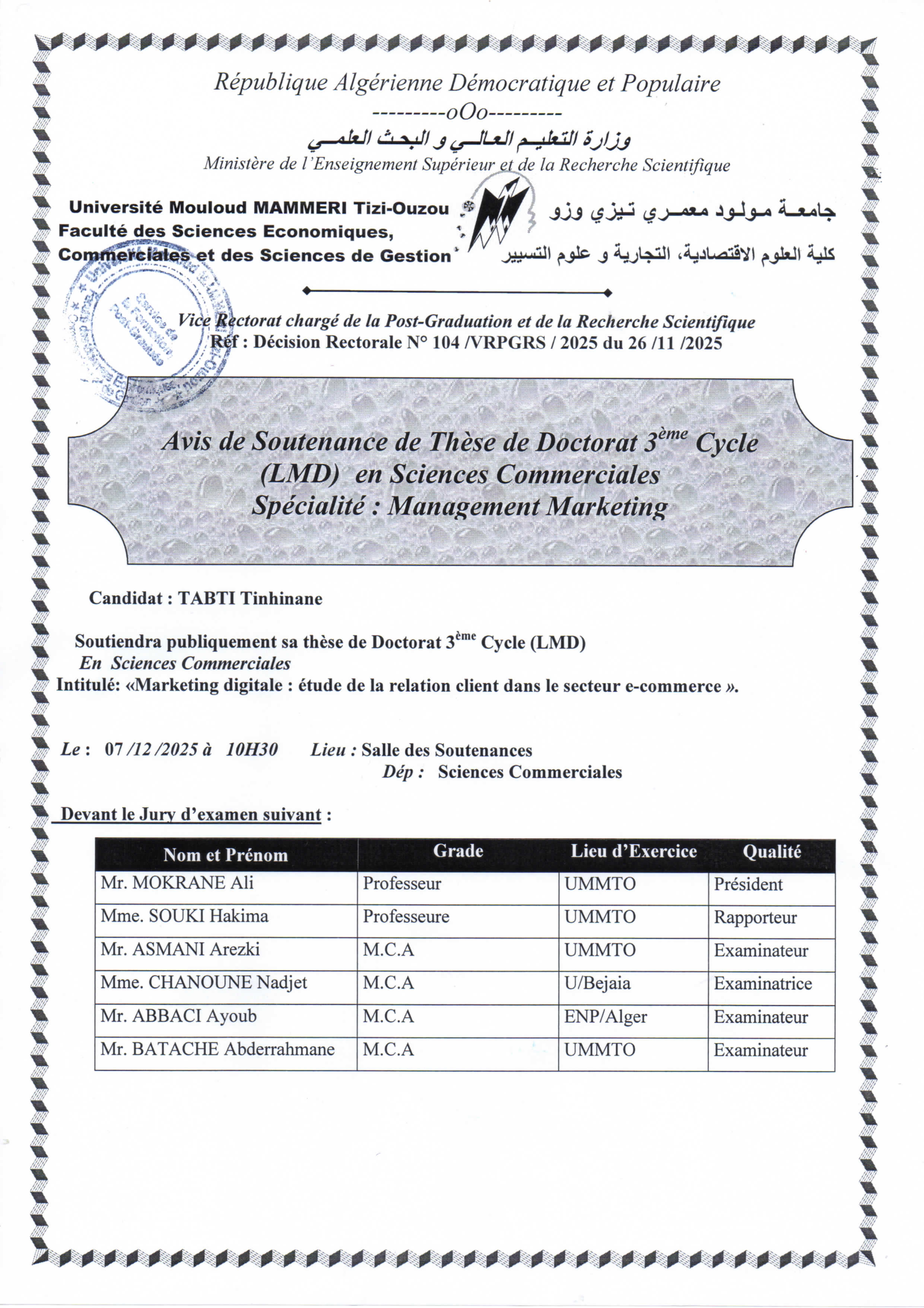 Avis de Soutenance de Thèse de Doctorat LMD en Sciences Commerciales de Mme TABTI Tinhinane.