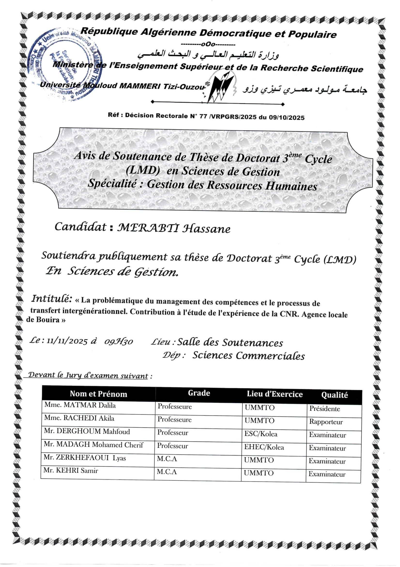 Avis de Soutenance de Thèse de Doctorat LMD en Sciences de Gestion de Mr MERABTI Hassane.