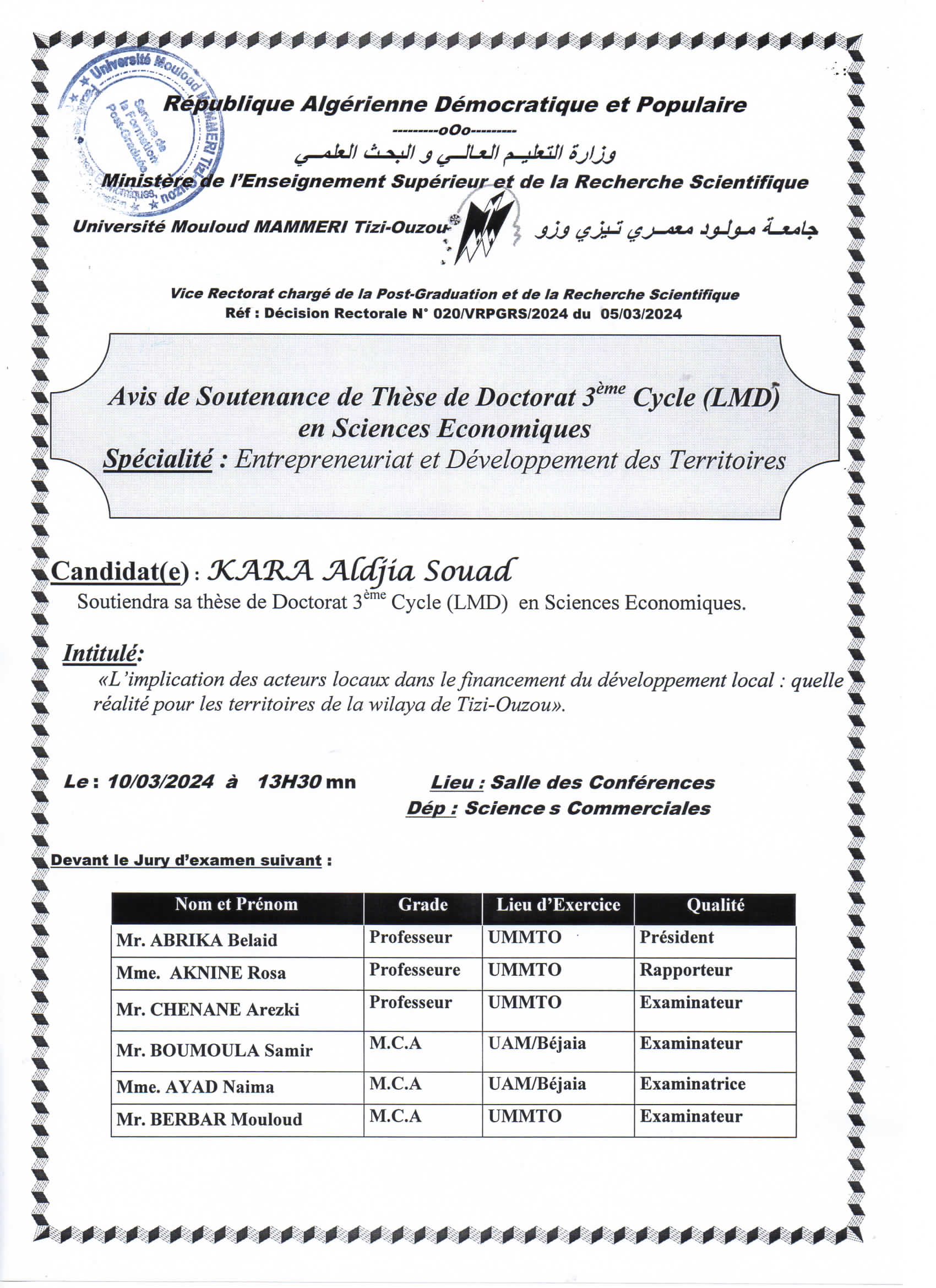 Avis de soutenance de thèse de Doctorat LMD de Melle KARA Aldjia Souad.