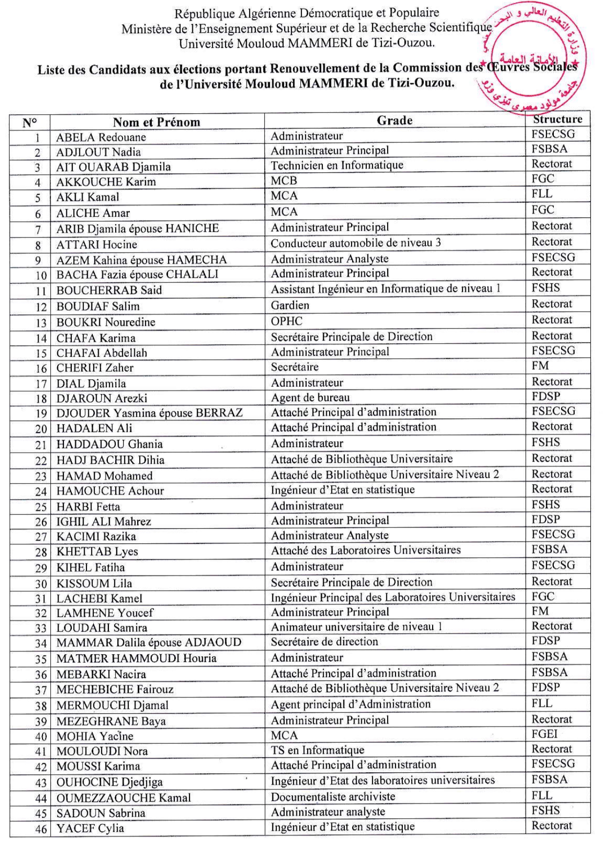 Les personnels Enseignants, ATS et Contractuels de l’université Mouloud MAMMERI de Tizi-Ouzou sont informés que les élections portant renouvellement de la commission des oeuvres sociales auront lieu le 18/03/2025 au niveau des facultés de rattachement pour les fonctionnaires relevant des facultés et à la salle des réunions au 6éme étage de la tour rectorale pour les fonctionnaires relevant des services centraux.