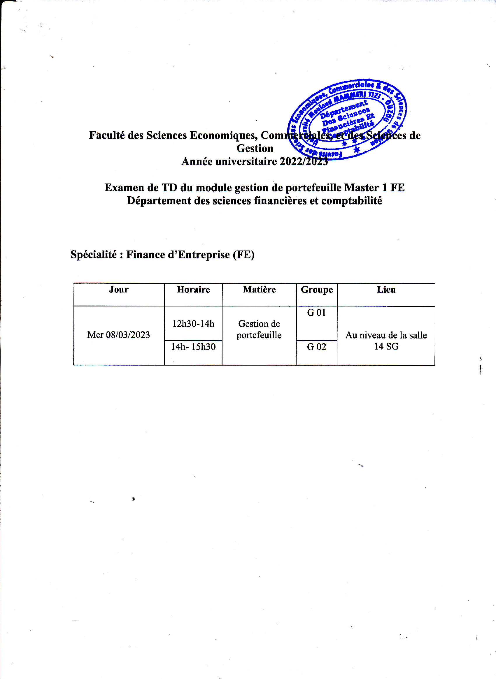 Planning des examens Sc Financières Hasnaoua