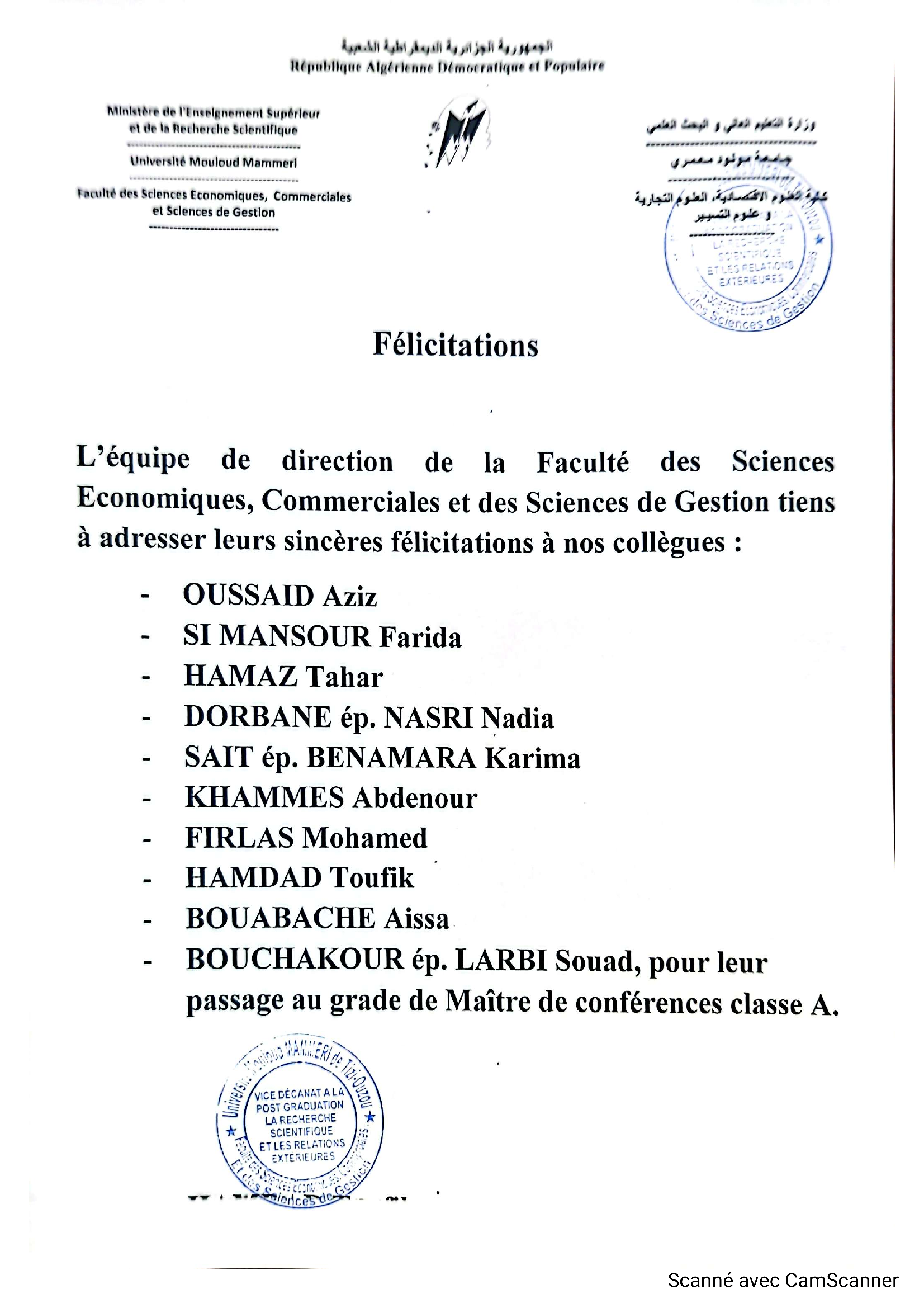 – Le Vice Doyen chargé de la post graduation, de la recherche scientifique et des relations extérieures