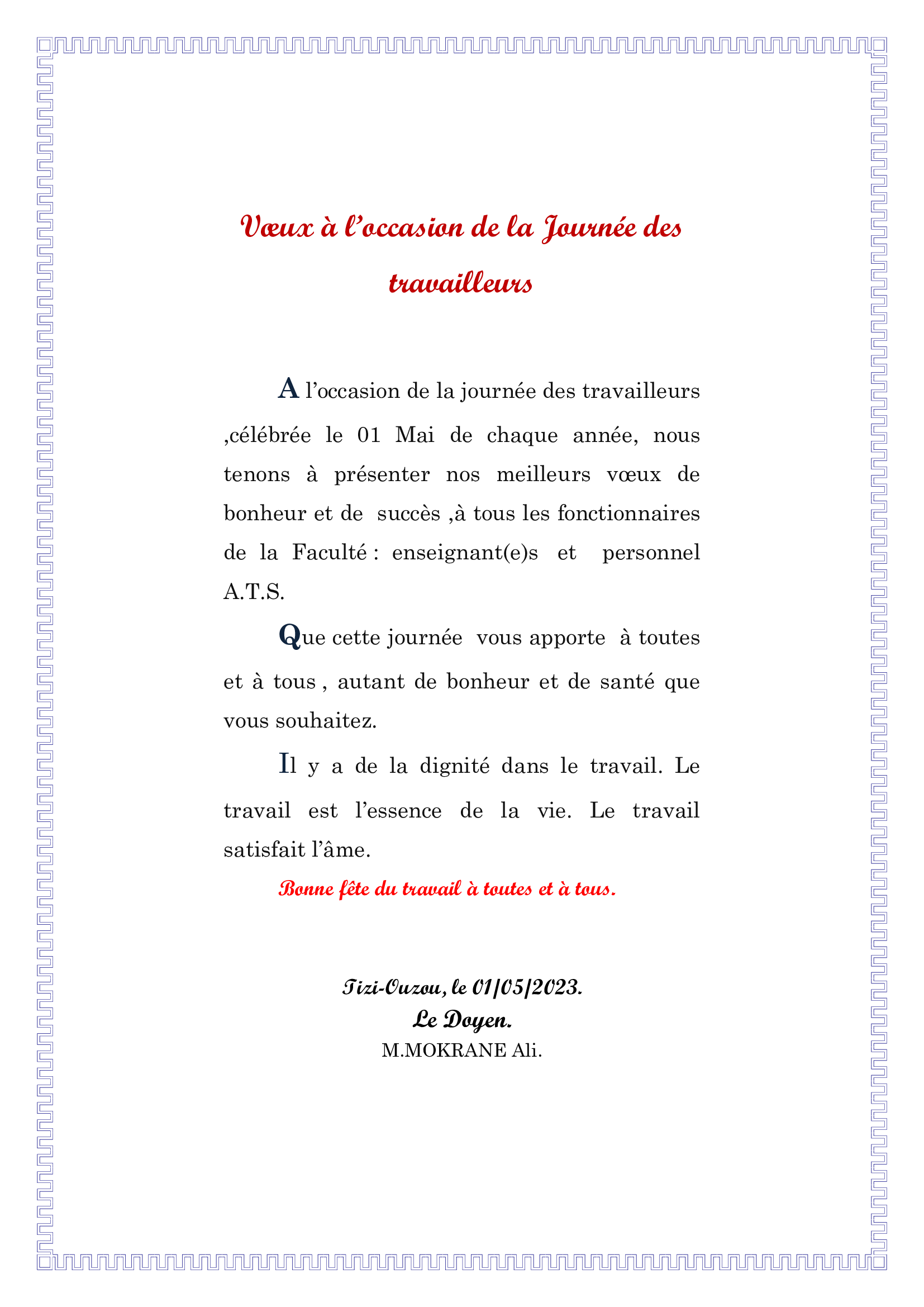 Fête du travail: Vœux de Monsieur le Doyen.