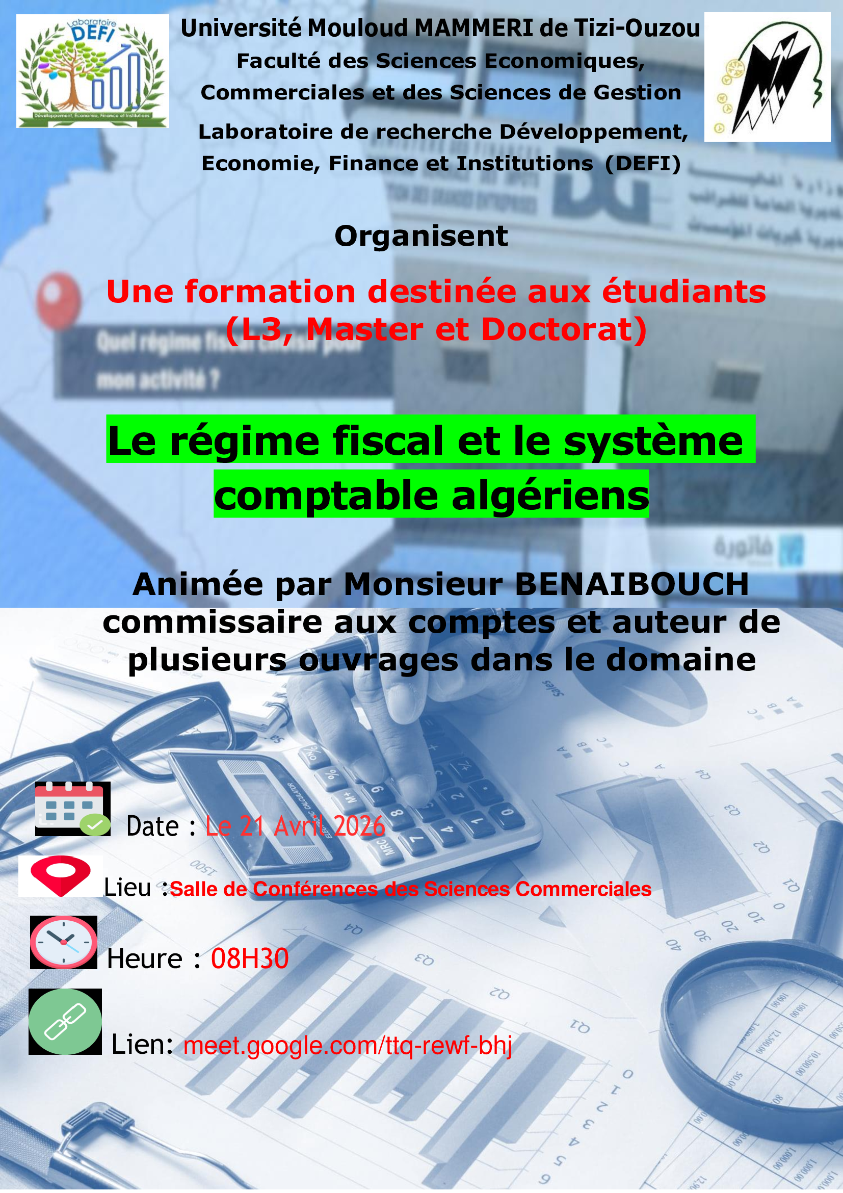 Le laboratoire de recherche DEFI de la faculté des sciences économiques, commerciales et des sciences de gestion, organise une formation, sous le thème « le régime fiscal et le système comptable algériens », destinée aux étudiants de L3, Master et Doctorat de la faculté.