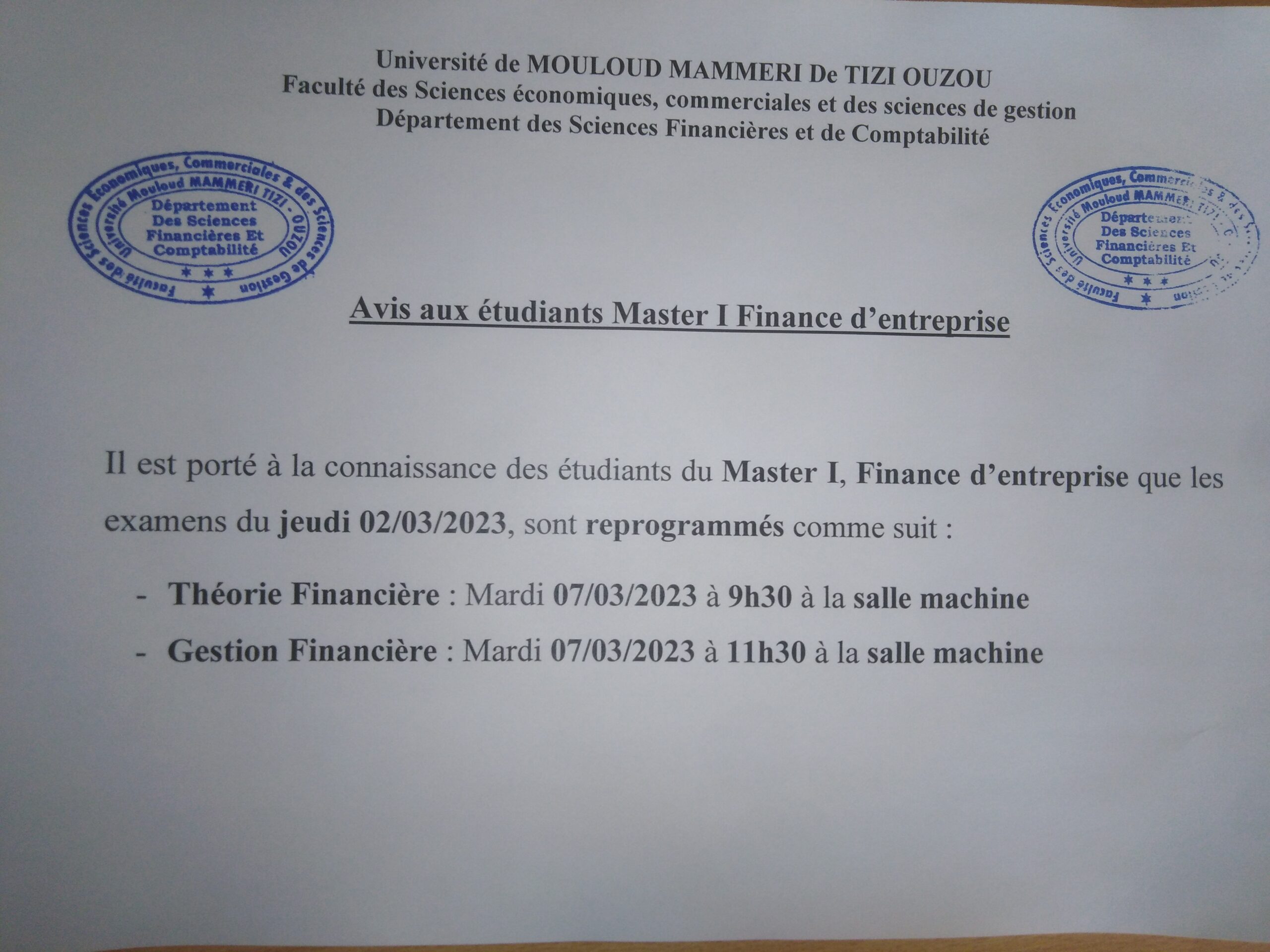 Planning des examens Sc Financières Hasnaoua