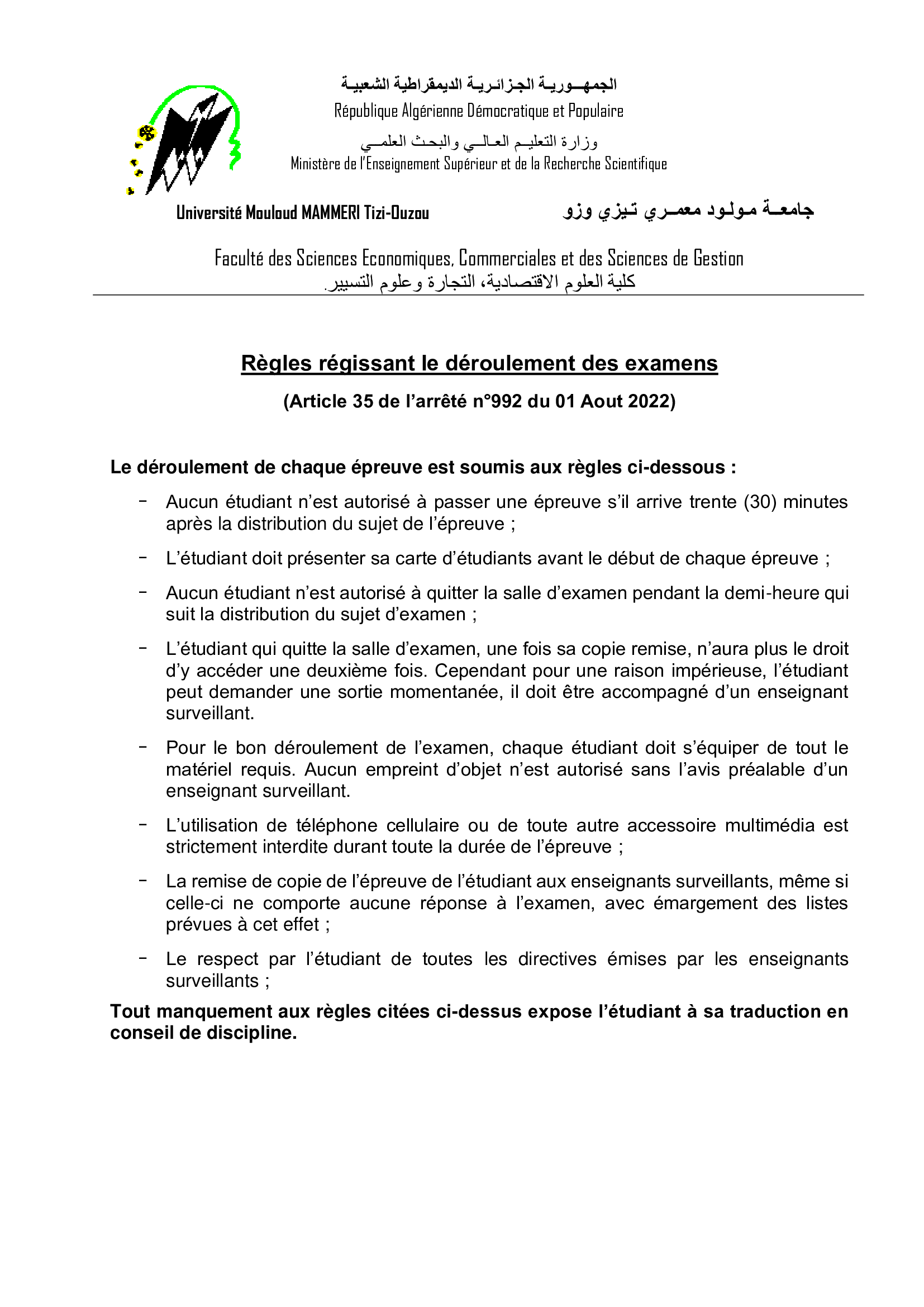Règles régissant le déroulement des examens.