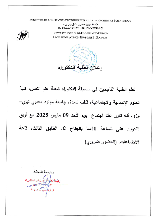 Avis aux candidats admis aux concours de doctorat en psychologie (2024/2025)