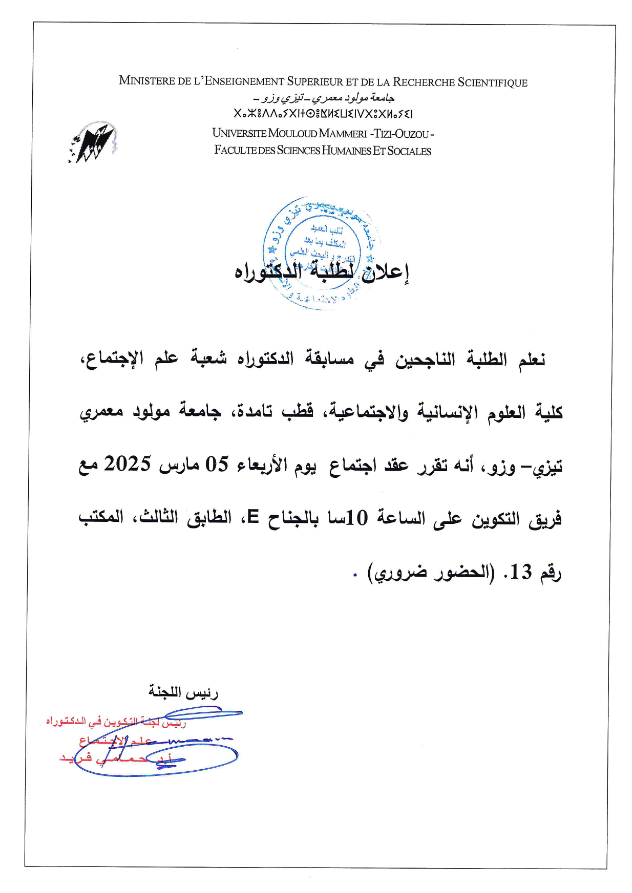 Avis aux candidats admis aux concours de doctorat en sociologie (2024/2025)