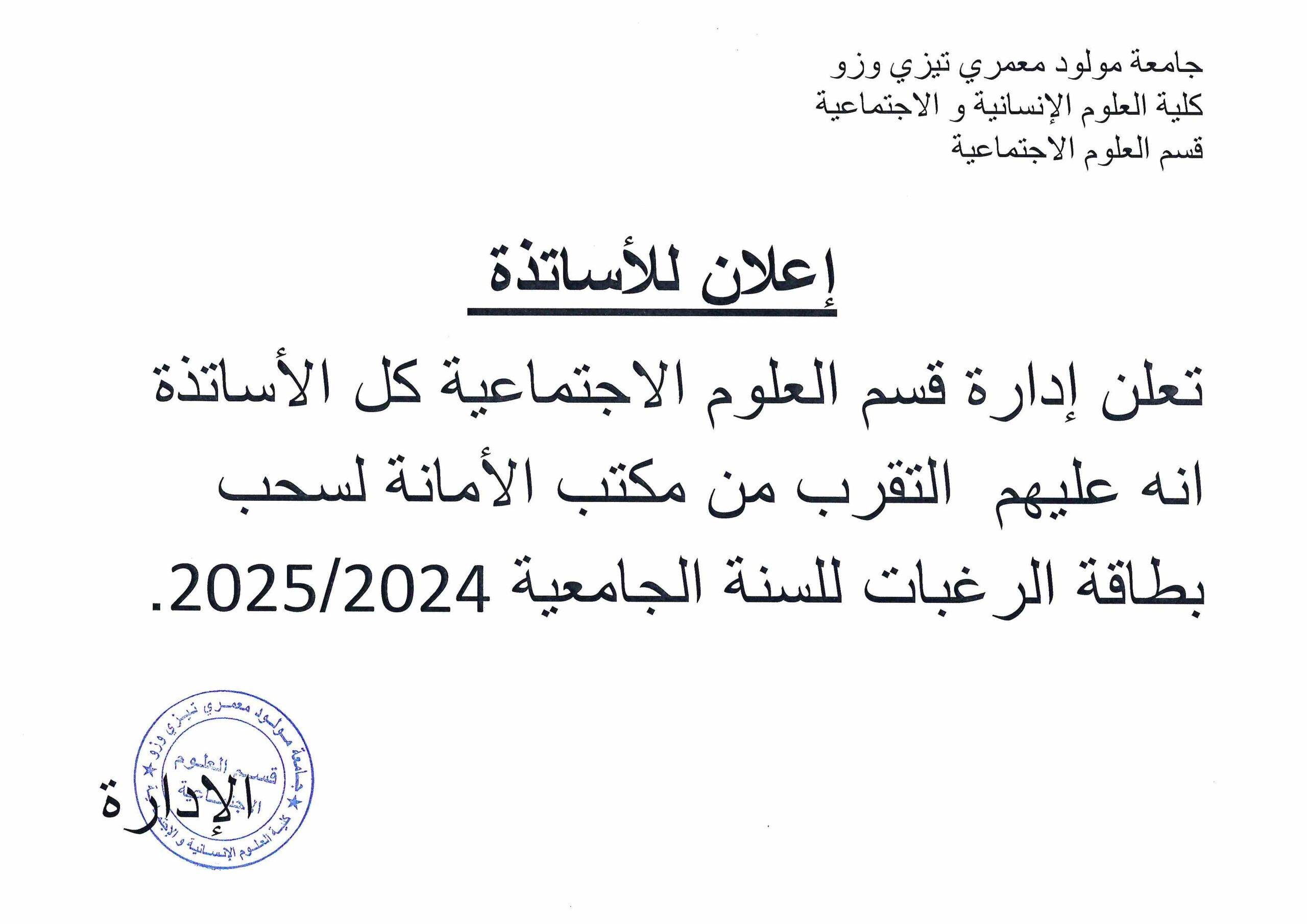 إعلان لطلبة الليسانس و الماستر قسم العلوم الإجتماعية