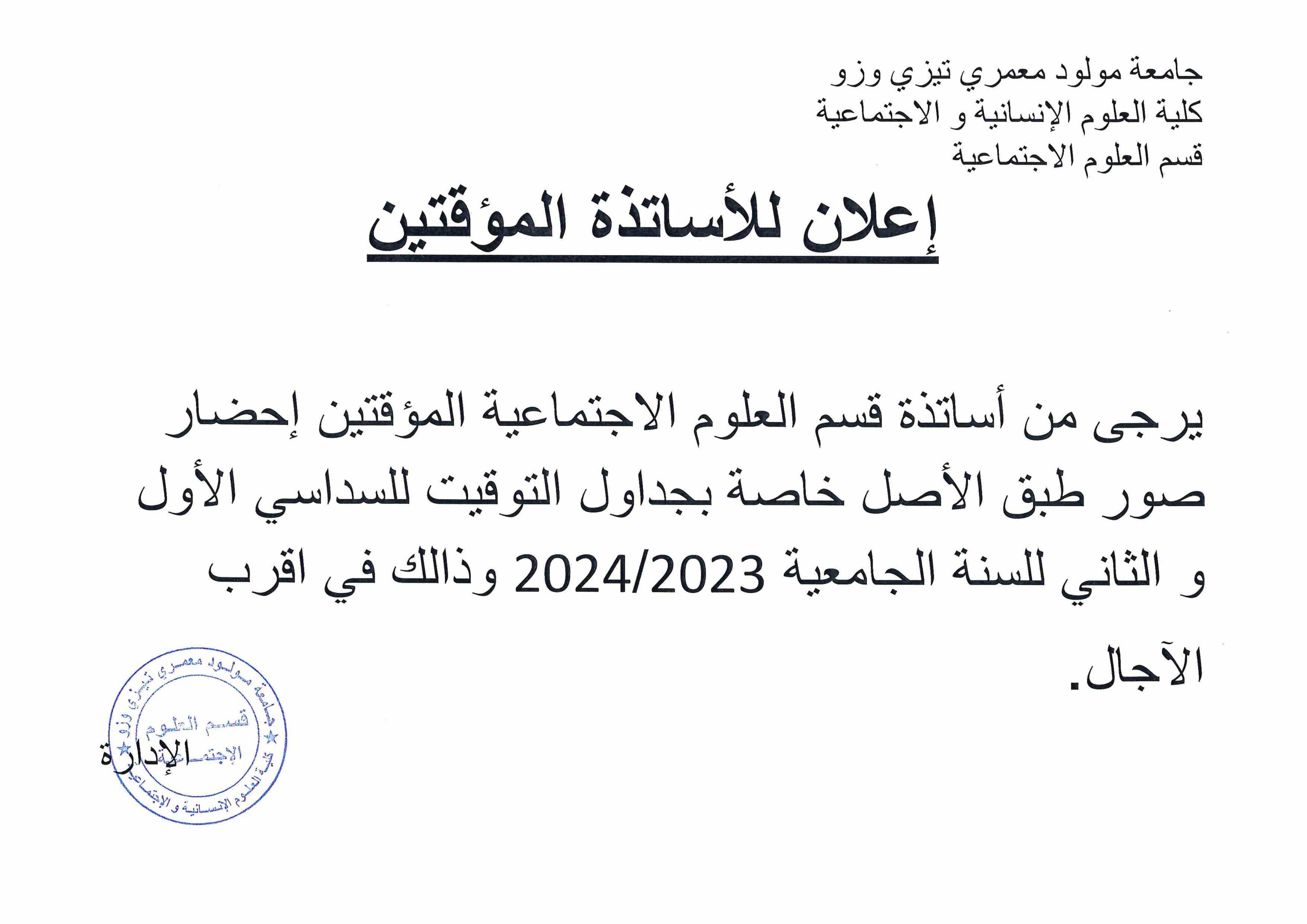 إعلان لطلبة الليسانس و الماستر قسم العلوم الإجتماعية