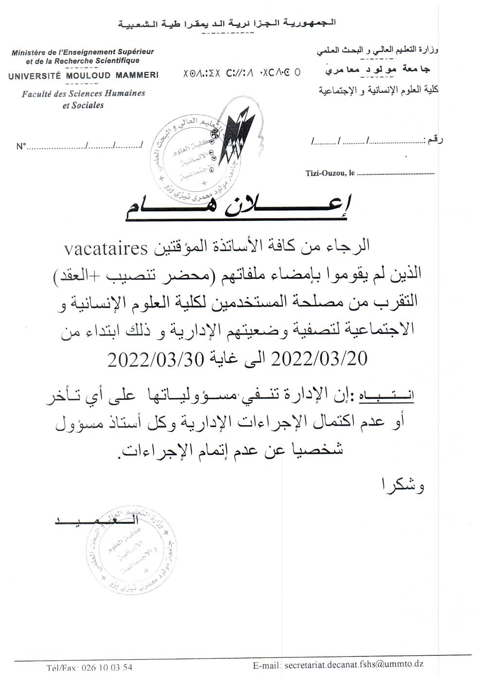 إعلان لطلبة السنة الاولى ليسانس