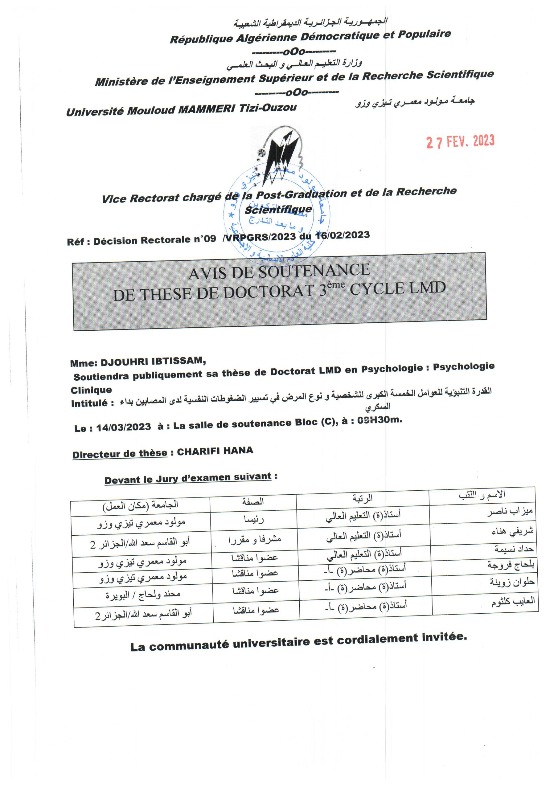 Avis de soutenance de Melle DJOUHRI Ibtissam