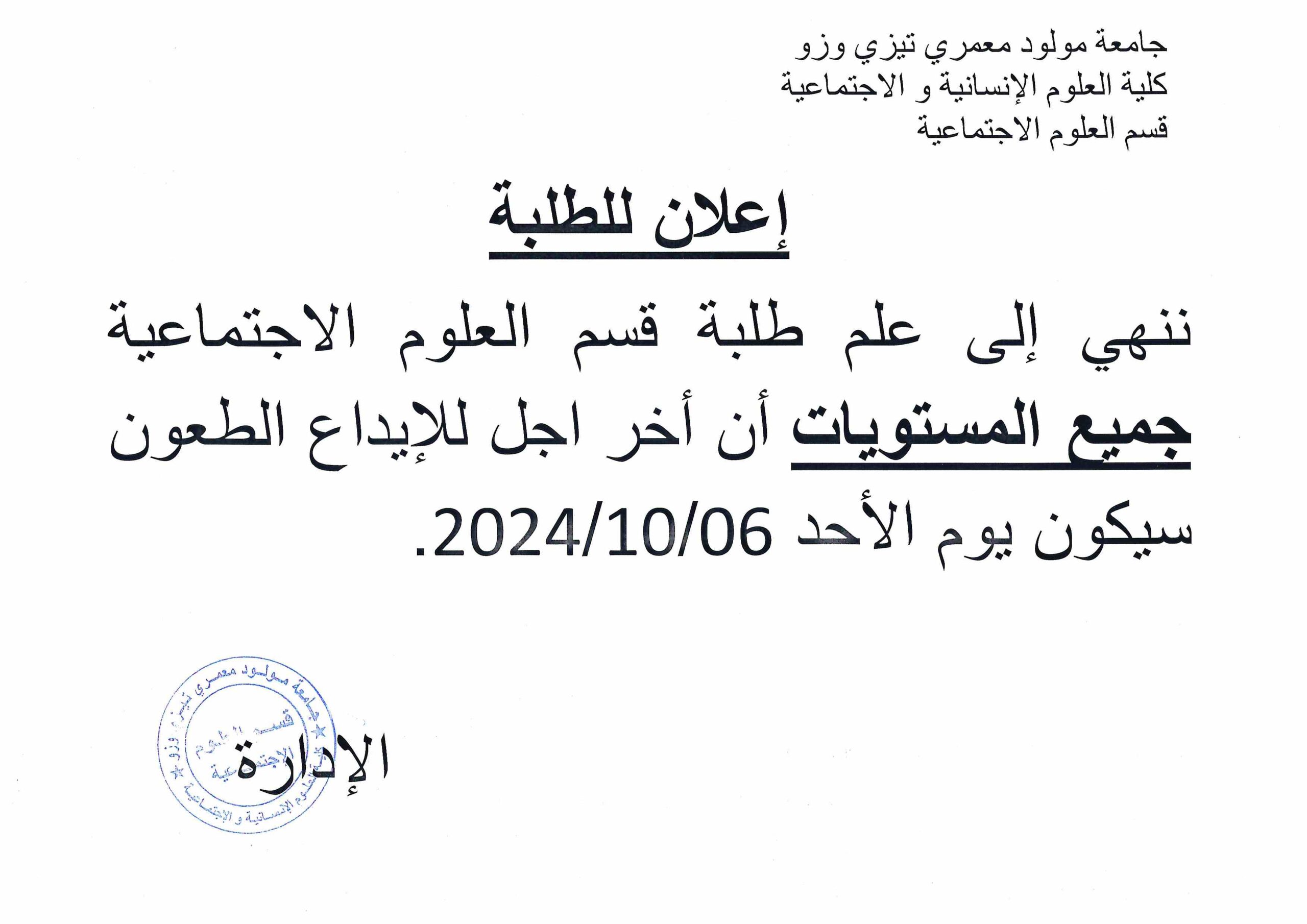 إعلان لطلبة الليسانس و الماستر قسم العلوم الإجتماعية