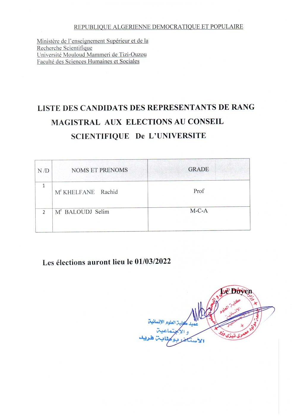 Liste des candidats des représentants de rang magistral aux élections au conseil scientifique de l’université