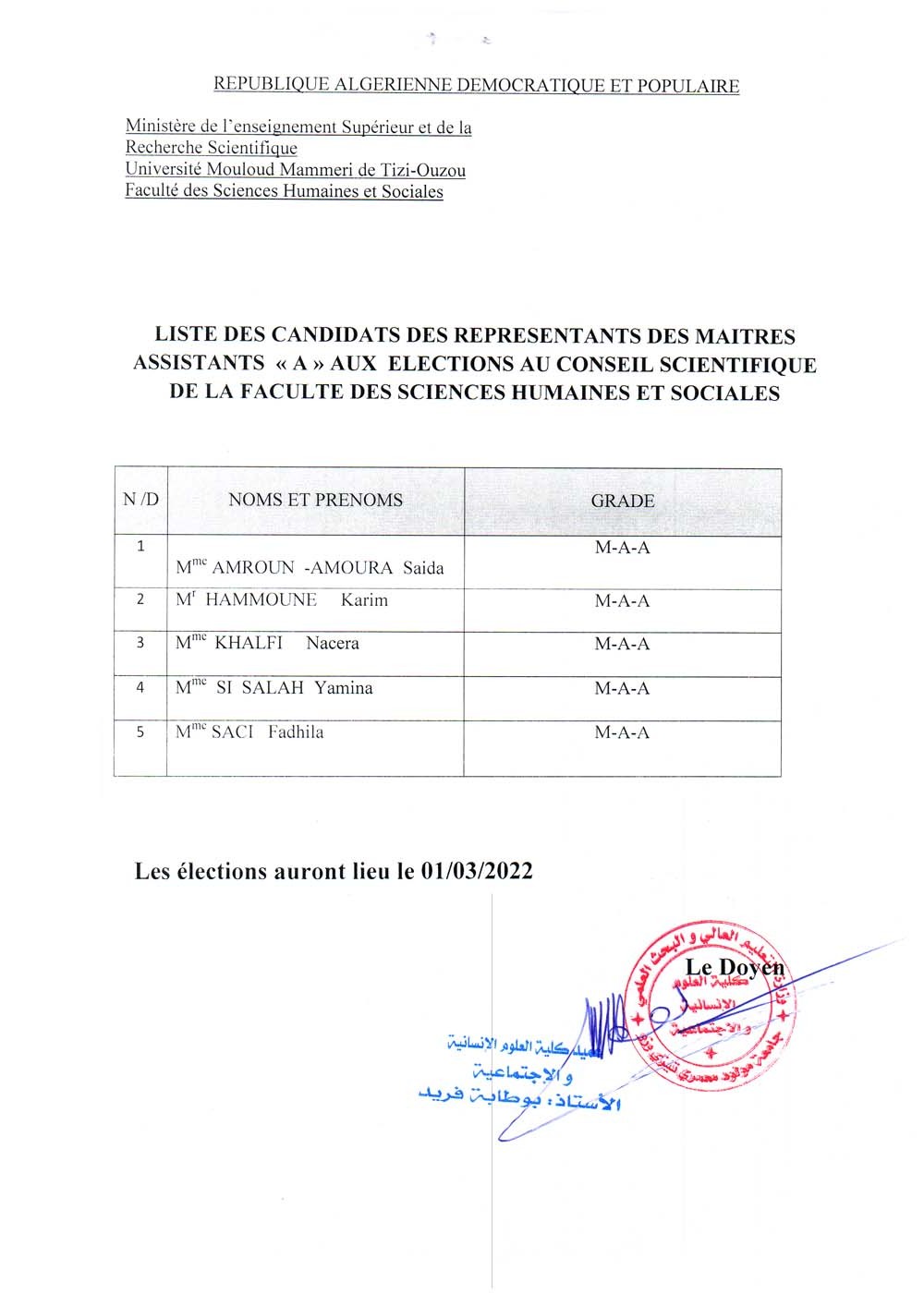 Liste des candidats des représentants des maitres assistants « A » aux élections au conseil scientifique de la FSHS