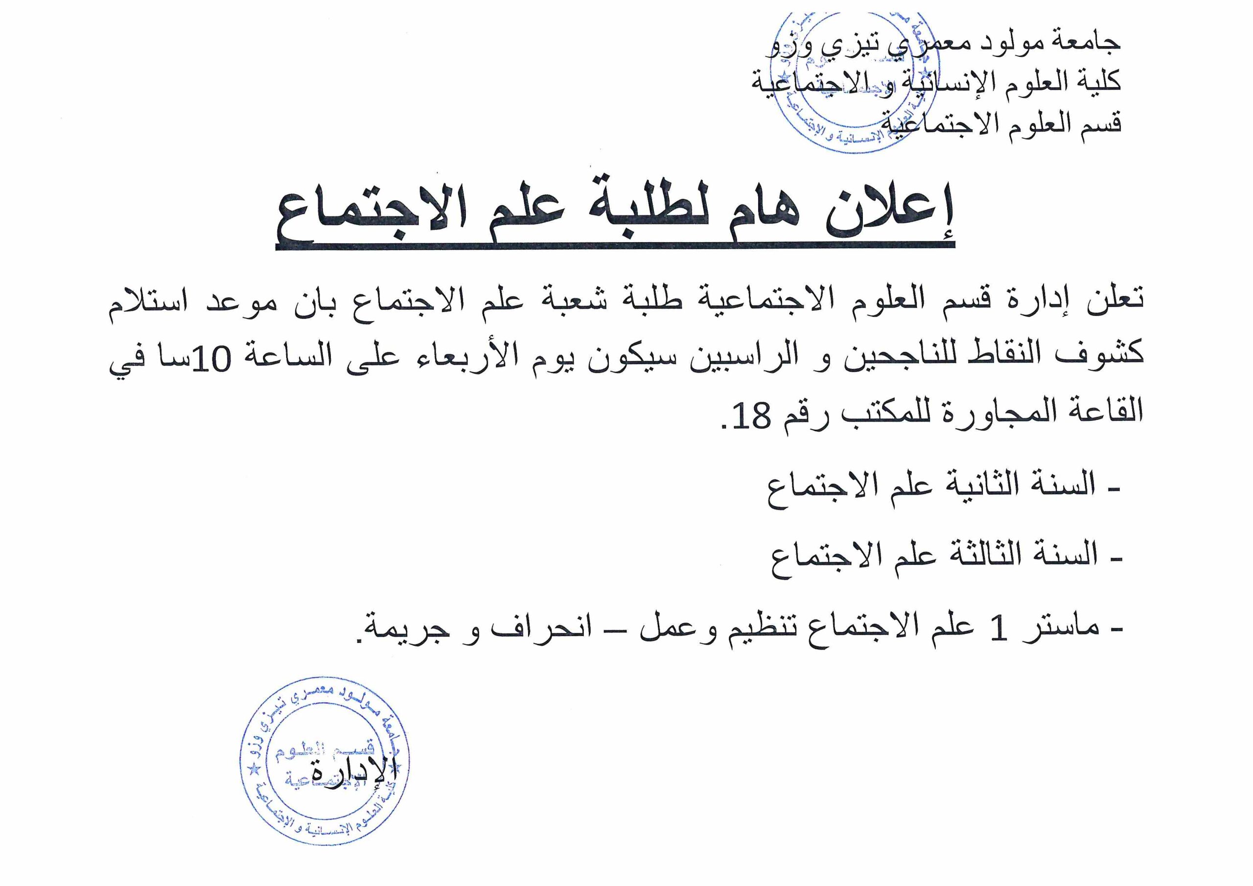 إعلان لطلبة الليسانس و الماستر قسم العلوم الإجتماعية