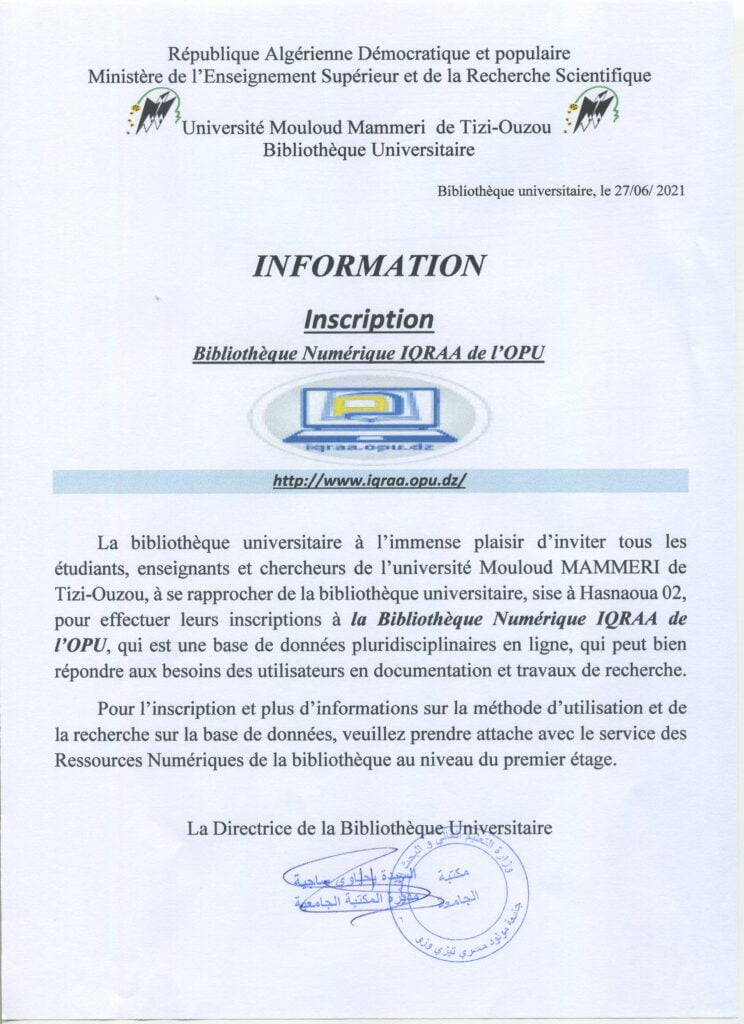 Inscription à Bibliothèque Numérique IQRAA de l’OPU