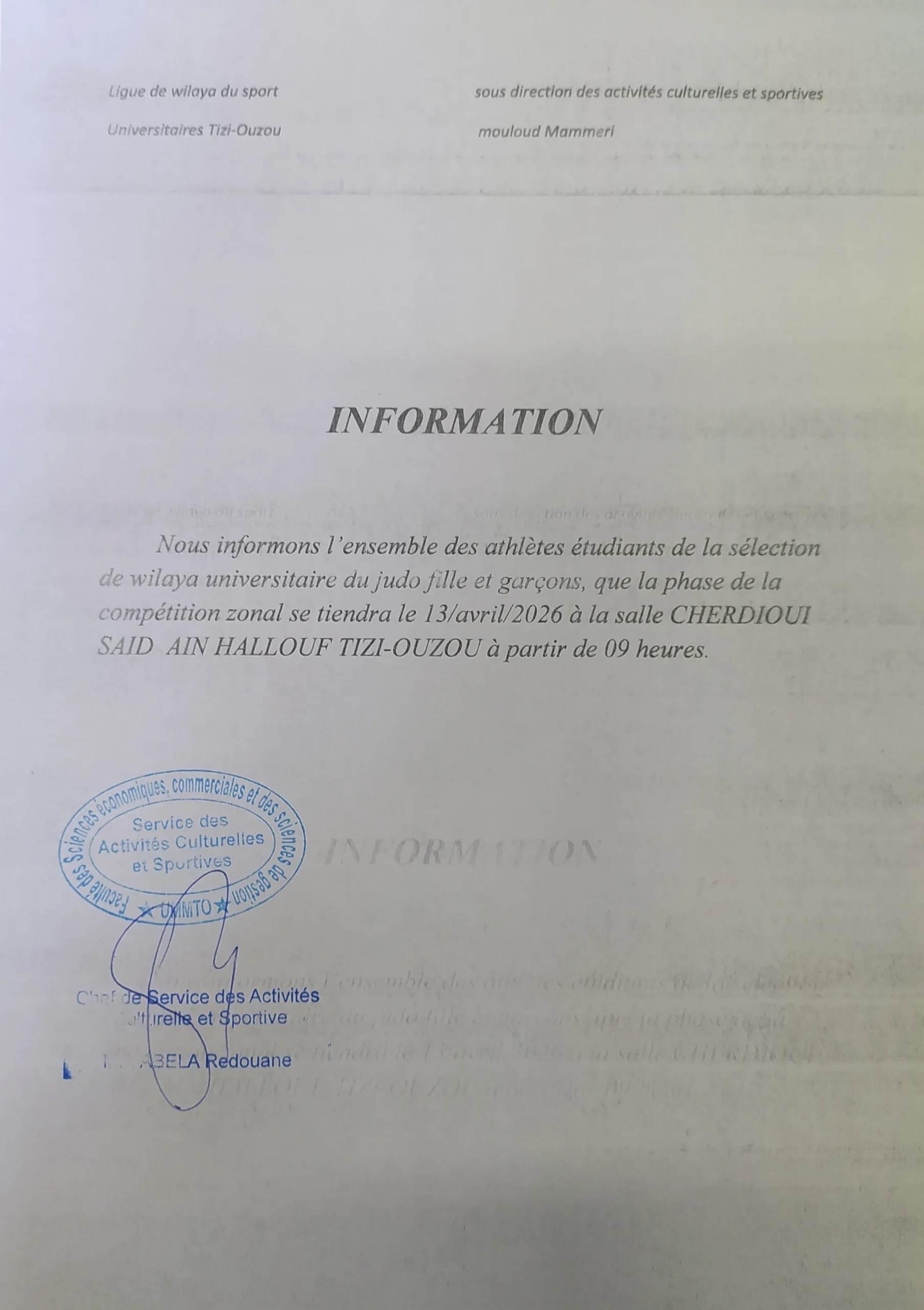 تجسيدا للبرنامج السنوي (2025-2026)، المتعلق بالأنشطة العلمية والثقافية والرياضية، الذي سطرته مديرية الحياة الطلابية بالتنسيق مع الديوان الوطني للخدمات الجامعية، يشرفنا إعلامكم...