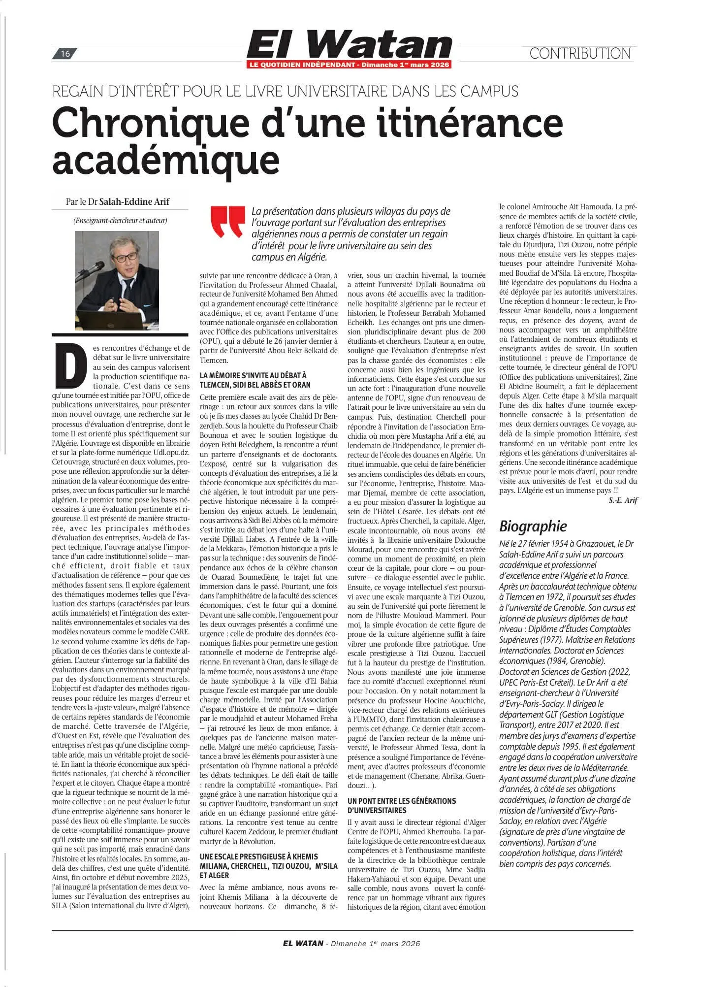 Dans une chronique publiée dans El Watan du dimanche 1er mars, le Dr Salah-Eddine Arif retrace sa tournée académique, initiée par l’OPU, à travers plusieurs universités algériennes et consacre un passage élogieux à son escale à l’Université Mouloud Mammeri de Tizi-Ouzou (UMMTO), soulignant la chaleur de l’accueil, l’excellence de l’organisation et la richesse des échanges scientifiques avec l’ensemble de la communauté académique.