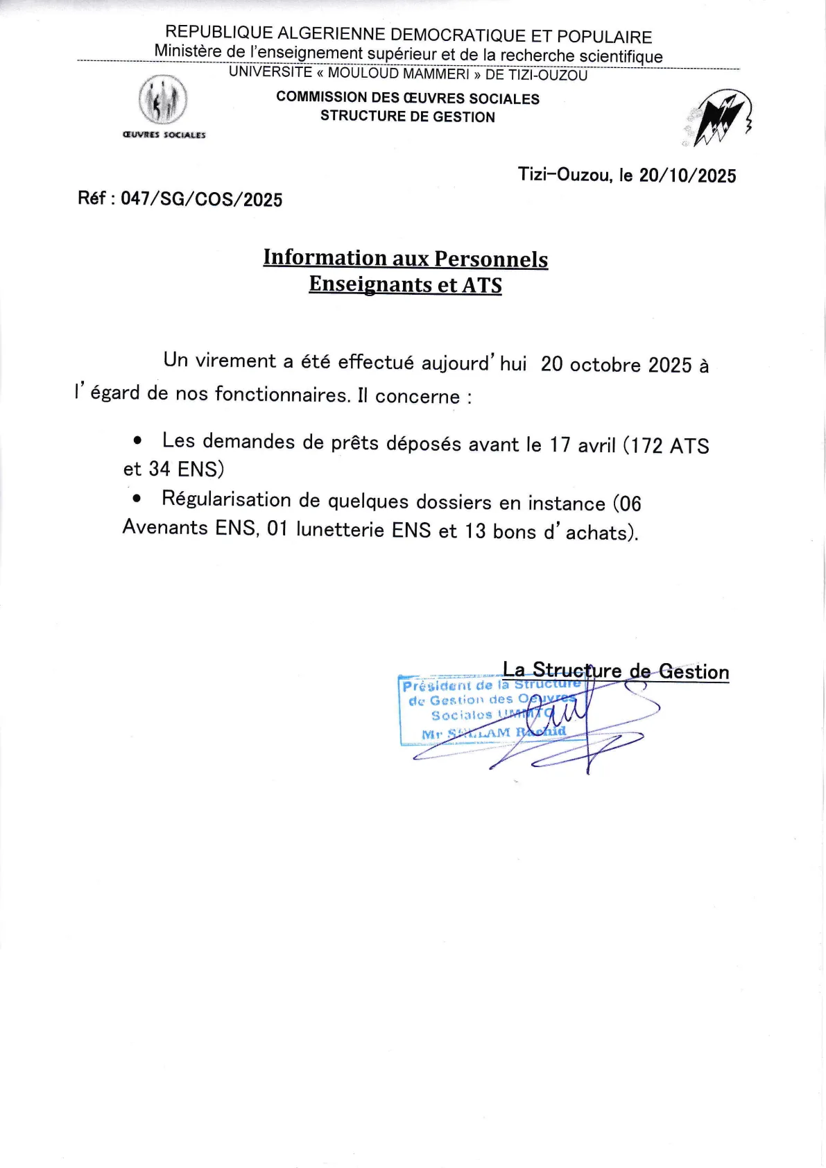 Aux Personnels Enseignants, ATS et Contractuels Les personnels Enseignants, ATS et Contractuels de l'université Mouloud MAMMERI de Tizi-Ouzou sont informés que les élections...